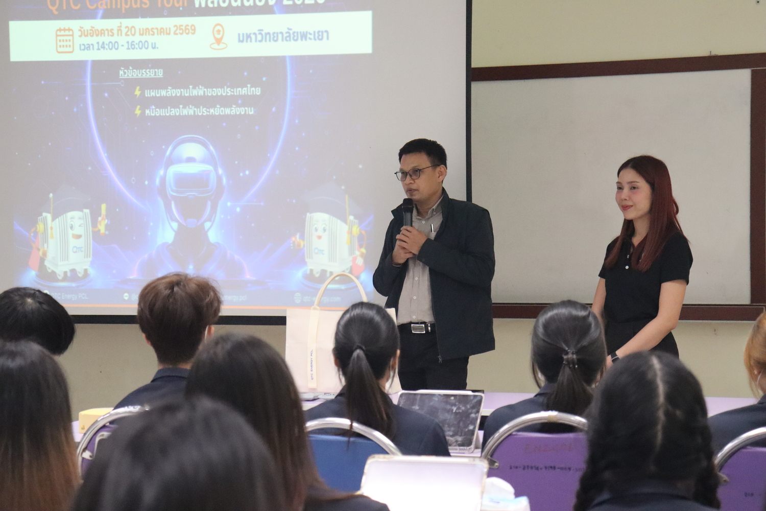 เมื่อวันที่ 20 มกราคม 2568 ที่ผ่านมา คณะวิศวกรรมศาสตร์ มหาวิทยาลัยพะเยา นำโดย ผู้ช่วยศาสตราจารย์ดวงดี แสนรักษ์ อาจารย์ประจำหลักสูตรวิศวกรรมศาสตรบัณฑิต สาขาวิชาวิศวกรรมไฟฟ้า เปิดบ้านให้การต้อนรับ บริษัท คิวทีซี เอนเนอร์ยี่ จำกัด (มหาชน) ภายใต้การจัดกิจกรรม “QTC CAMPUS TOUR พี่สอนน้อง 2026” สำหรับนิสิตภายในสาขาวิชาวิศวกรรมไฟฟ้า ชั้นปีที่ 3 ณ ห้อง EN 4206 อาคารคณะวิศวกรรมศาสตร์ มหาวิทยาลัยพะเยา โดยได้รับเกียรติจาก รองศาสตราจารย์ ดร.ณัฐพงศ์ ดำรงวิริยะนุภาพ คณบดีคณะวิศวกรรมศาสตร์ ร่วมให้การต้อนรับ
