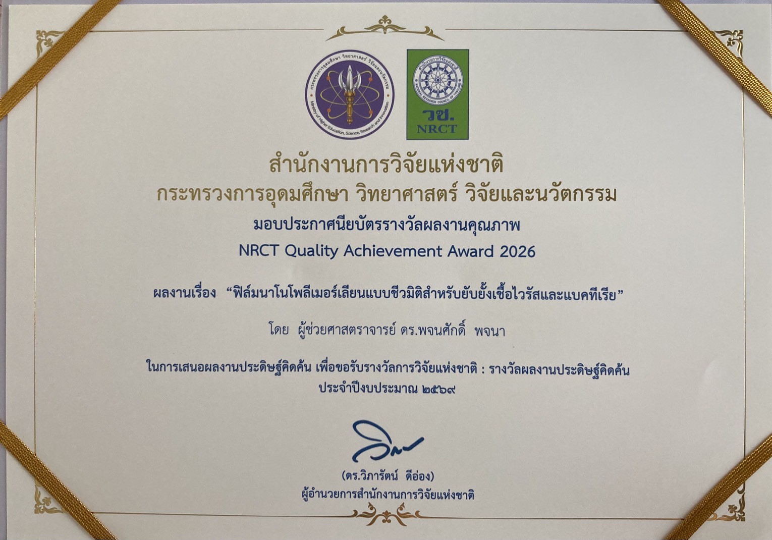 สำหรับรางวัลผลงานคุณภาพ “NRCT Quality Achievement Award” ประจำปีงบประมาณ 2569 มีผลงานที่ผ่านการคัดเลือกจำนวนทั้งสิ้น 230 ผลงาน แบ่งเป็นผลงานวิจัย 78 ผลงาน วิทยานิพนธ์ 87 เรื่อง และผลงานประดิษฐ์คิดค้น 65 ผลงาน ครอบคลุมหลากหลายสาขา อาทิ วัสดุนาโนและพลังงานสะอาด เทคโนโลยีการแพทย์และการวินิจฉัยโรคด้วยปัญญาประดิษฐ์ การพัฒนาวัคซีนและการศึกษาภูมิคุ้มกัน งานวิจัยด้านเกษตรกรรมยั่งยืน การเพิ่มมูลค่าของเสียและการขับเคลื่อนเศรษฐกิจหมุนเวียน ตลอดจนการประยุกต์ใช้องค์ความรู้ขั้นสูงเพื่อยกระดับขีดความสามารถในการแข่งขันของประเทศในมิติเศรษฐกิจ สังคม และสิ่งแวดล้อม