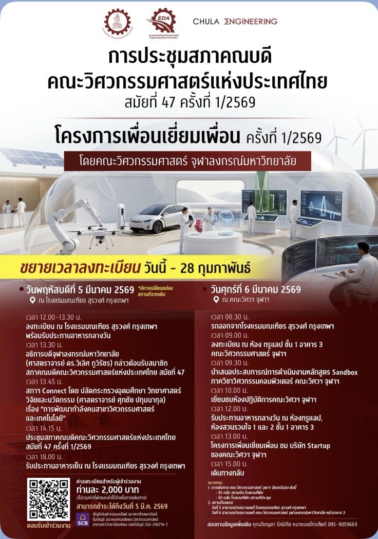รองศาสตราจารย์ ดร.ณัฐพงศ์ ดำรงวิริยะนุภาพ คณบดีคณะวิศวกรรมศาสตร์ มหาวิทยาลัยพะเยา เข้าร่วมการประชุมสภาคณบดีคณะวิศวกรรมศาสตร์แห่งประเทศไทย สมัยที่ 47 ครั้งที่ 1/2569 พร้อมทั้งเข้าร่วมโครงการ “เพื่อนเยี่ยมเพื่อน” ครั้งที่ 1/2569 ระหว่างวันที่ 5 – 6 มีนาคม 2569 ซึ่งจัดขึ้นโดย คณะวิศวกรรมศาสตร์ จุฬาลงกรณ์มหาวิทยาลัย ในฐานะเจ้าภาพจัดการประชุม ณ ห้องประชุม 308 โรงเรียนนายร้อยพระจุลจอมเกล้า